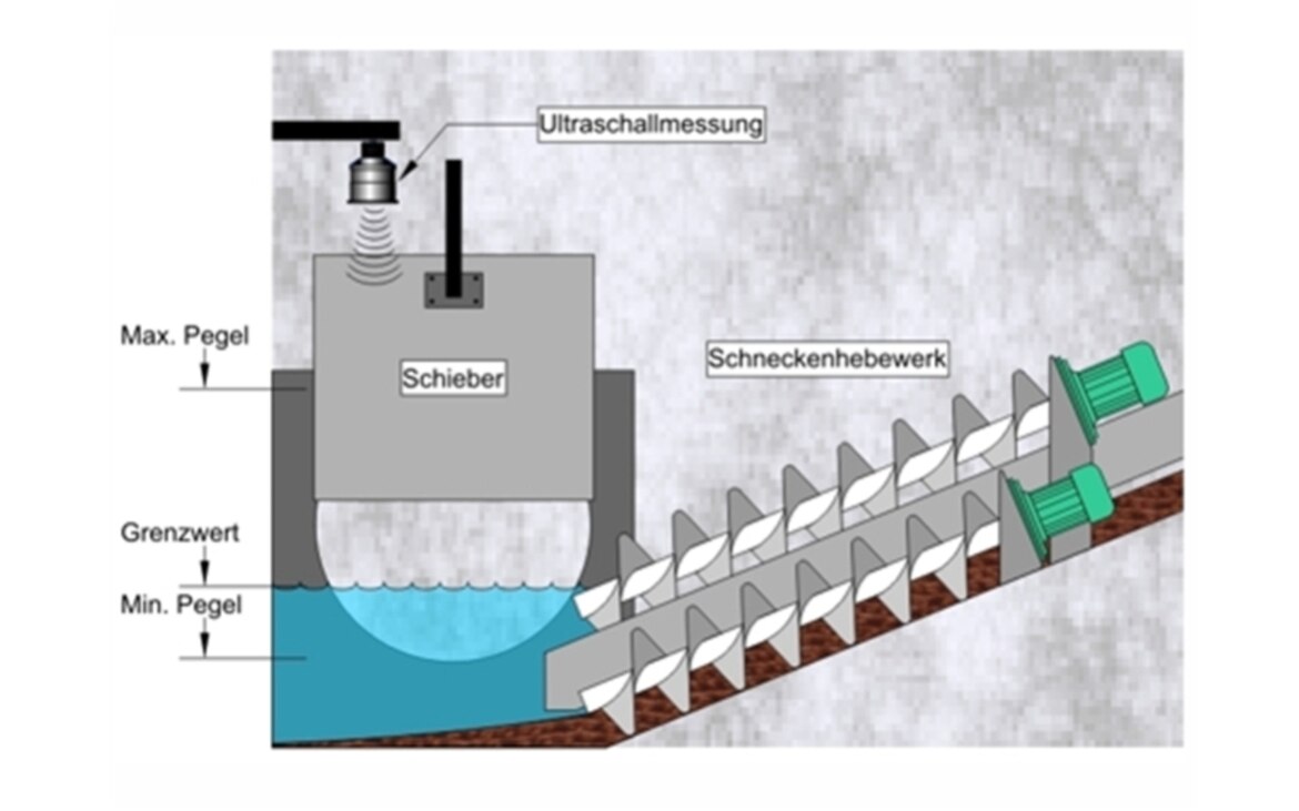 - Es wurde eine Ultraschallmessung vom Typ NivuMaster mit 5 Relais in Fronttafelausführung eingesetzt. Diese bietet nicht nur die wechsel-seitige Ansteuerung der Förderschnecken, sondern auch eine Minimum- / Maximum-meldung.