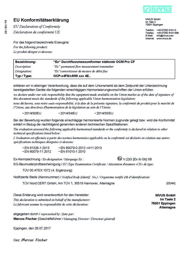 Déclaration de conformité "Capteurs ultrasoniques temps de transit NivuSonic"