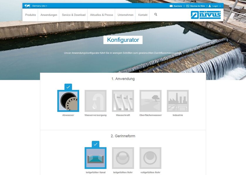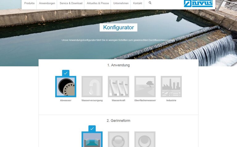 Users can choose suitable products on the NIVUS website from the different product categories and concrete application examples parallel to the configurator.