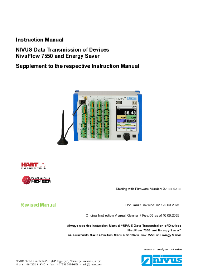 Instruction Manual | NIVUS Data Transmission of Devices NivuFlow 7550 and Energy Saver - Supplement to the respective Instruction Manual (Rev. 02)