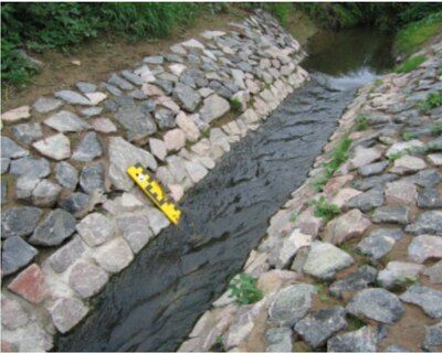 - Concrete channel bottom, embankment reinforced with water engineered stones