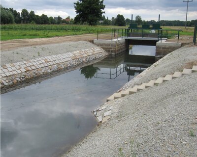 - Concrete channel bottom, embankment reinforced with water engineered stones
