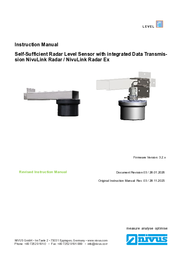 Betriebsanleitung | Autarker Radar-Füllstandssensor mit integrierter Datenübertragung NivuLink Radar / NivuLink Radar Ex (Rev. 03)