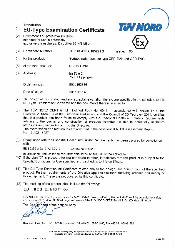 EU Declaration of Conformity | "EX" Surface Radar Typ OFR-EV0-xxx / EVG-xxx