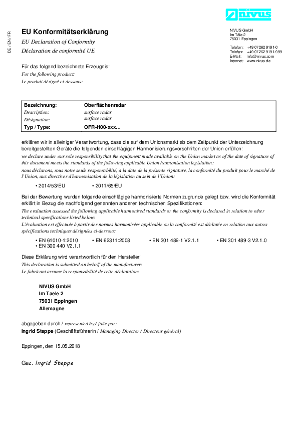 EU Konformitätserklärung | Oberflächenradar OFR-H00-xxx