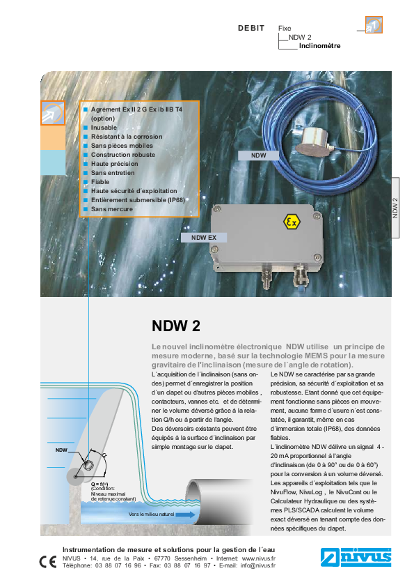 Le NDW se caractérise par sa grande précision, sa sécurité d´exploitation et sa robustesse. Etant donné que cet équipement fonctionne sans pièces en mouvement, aucune forme d´usure n´est constatée, il garantit, même en cas d´immersion totale (IP68), des données fiables.