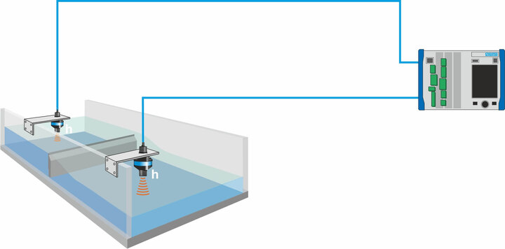 Sur des déversoirs avec reflux, le facteur de correction de déversement nécessaire pour la mesure de débit ou pour l´acquisition du déversement, change. Par le biais de deux mesures de niveau parallèles installées dans l´eau d´amont et l´eau d´aval, le degré de reflux actuel sur le déversoir peut être calculé. Ainsi, le facteur de correction de déversement pour la situation actuelle peut être déterminé et à l´aide d´un transmetteur approprié, p. ex. le Calculateur Hydraulique Plus, le débit ou le déversement correct peut être enregistré.