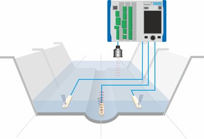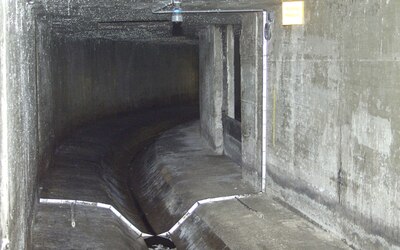 - Aby wykryć małe objętości, pierwszy czujnik został zainstalowany w kanale suchym. Czujniki 2 i 3 zostały zainstalowane po lewej i prawej stronie kanału suchej pogody w bocznym stopniu.W połączeniu z czujnikiem 1 wykrywają prędkości przepływu na wyższych poziomach lub rozładowanie połączonej wody.