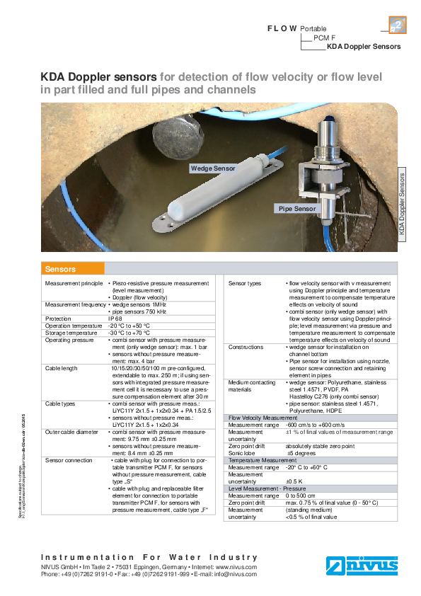 Czujniki KDA (pomiar prędkości przepływu) znajdują zastosowanie w pomiarach ciągłych w leeko i bardzo zanieczyszczonych mediach. Klinowa budowa korpusu czujnika pozwala na instalację na dnie i ścianie kanału.