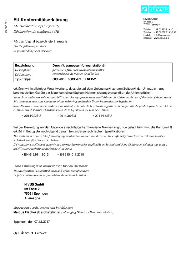 Declaration of Conformity "Ex Permanent flow measurement transmitter OCM F / OCM FR / NFP